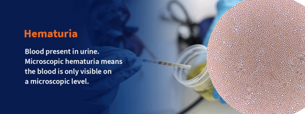 - Hematuria: Blood present in urine. Microscopic hematuria means the blood is only visible on a microscopic level, while gross hematuria means blood is present in urine to the naked eye.