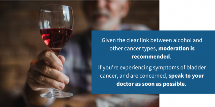 Given the clear link between alcohol and other cancer types, moderation is recommended. If you’re experiencing symptoms of bladder cancer, and are concerned, speak to your doctor as soon as possible.