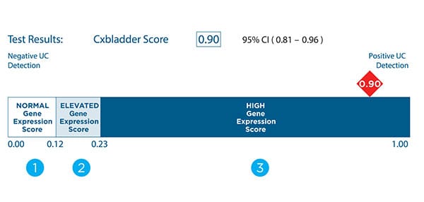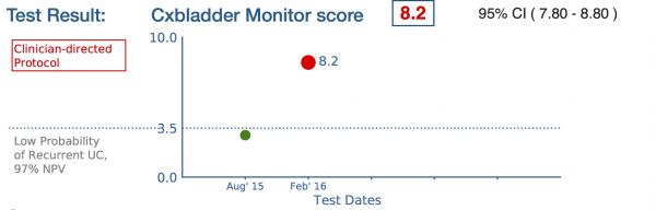 A Cxbladder Monitor score of ≥ 3.5 indicates that a clinician-directed protocol to determine the presence of recurrent UC, is warranted.