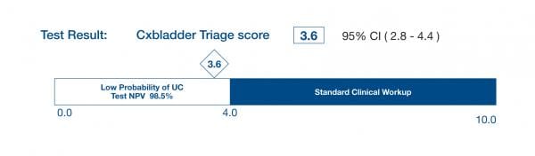 The Cxbladder Triage score ranges from 0.0 to 10.0. Using a cut-off of 4.0, it identifies patients who have a low probability of having UC.