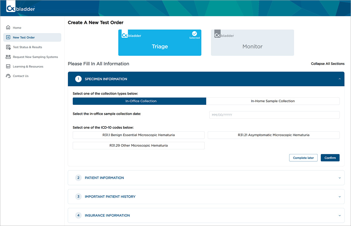 The Cxbladder Portal is a secure and easy to use platform that streamlines the online ordering and resulting of tests within the Cxbladder suite. The portal is ideal for community-based urology clinics and access is provided as a practice benefit at no cost.