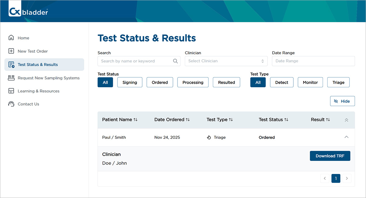 Past results for a clinic will be pre-loaded upon registration, and the results of all Cxbladder tests ordered from that point on will be available via the portal regardless of where the order originated.